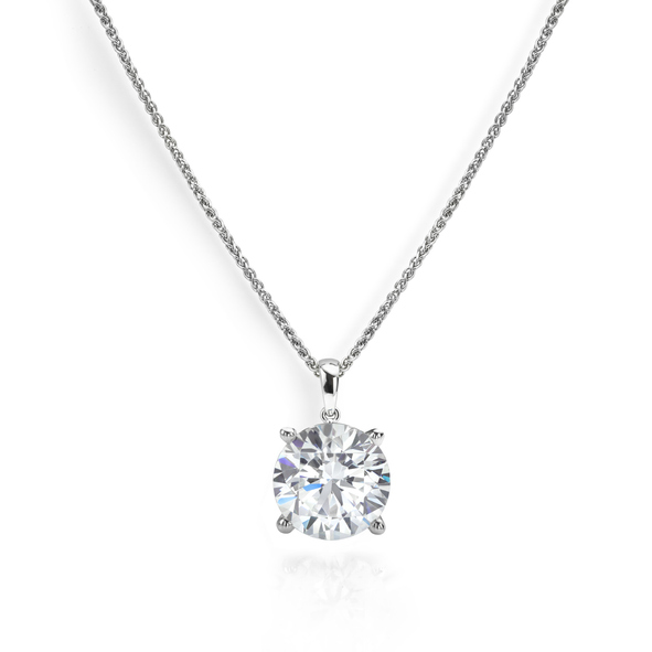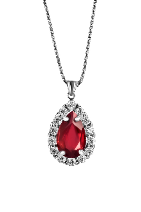 Ruby and diamonds pendant hanging on a chain isolated over white closeup
